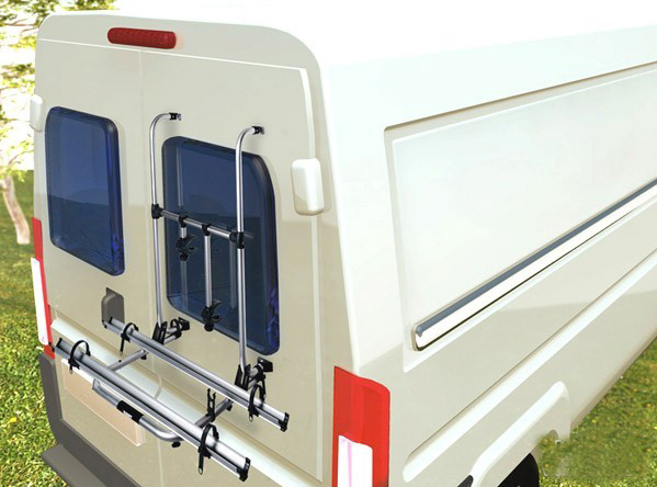 自行式房車一般只能裝到后面,值得注意的是車身后面的安裝位置是否會與其它裝備有所干涉。通常出于安全考慮,自行車架都是裝到后側中間位置,如果后側有左右門或爬梯,那么只能選擇在右側安裝的自行車架,如果后側無門也無爬梯,那么要考慮后側是否有窗戶,若沒有窗戶,則可以選擇安裝桿較長的自行車架。